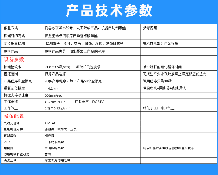 機(jī)械人自動(dòng)鎖螺絲機(jī),鎖付產(chǎn)品可機(jī)械手或坐標(biāo)龍門式結(jié)構(gòu),鎖付工作支持yz多種結(jié)合;支持前放前取,前放后取;平均1.5-2.0秒/顆螺,速度穩(wěn)定
