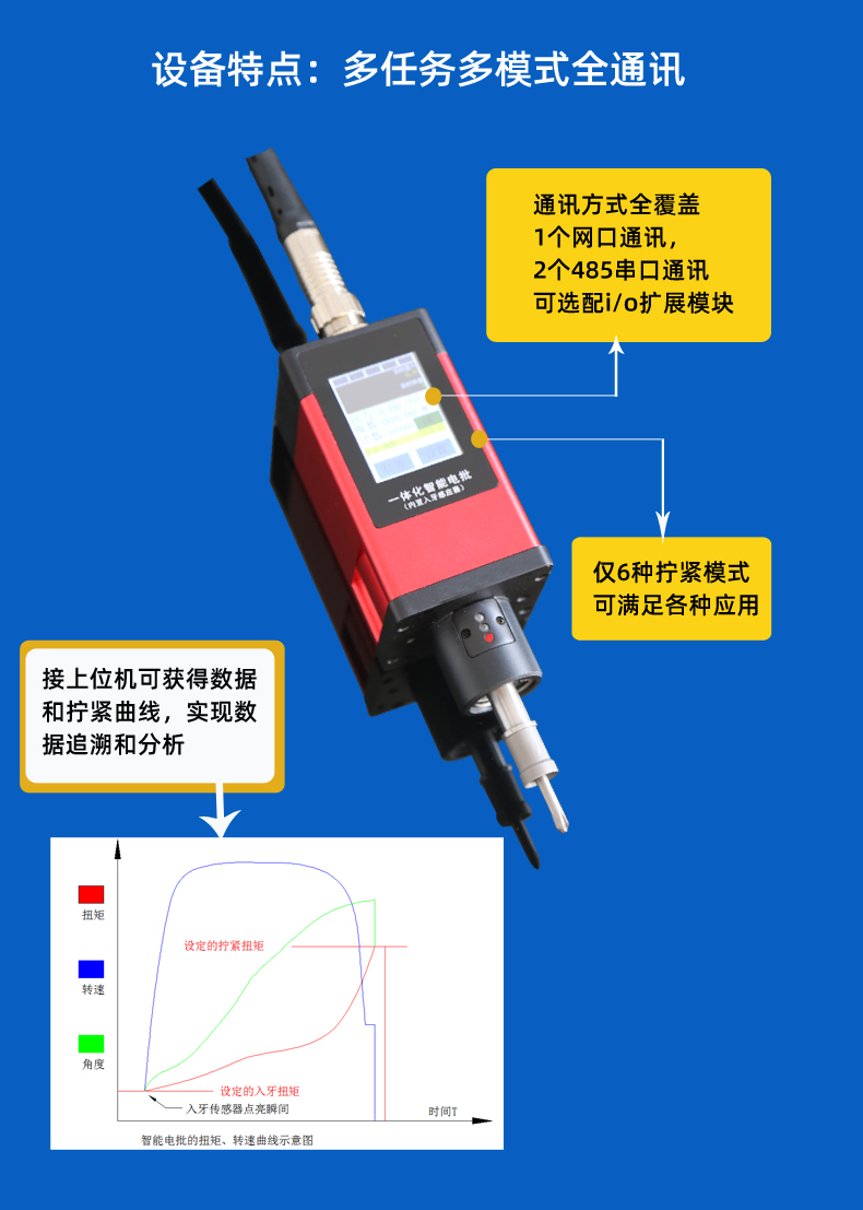 一體化智能電批特點(diǎn): 一件頂三件 柔性輸出軸,內(nèi)置深度傳感器 智能學(xué)習(xí)模式,無需繁鎖設(shè)置,內(nèi)置工藝應(yīng)用 網(wǎng)口串口通訊全覆蓋,多任務(wù)多模式